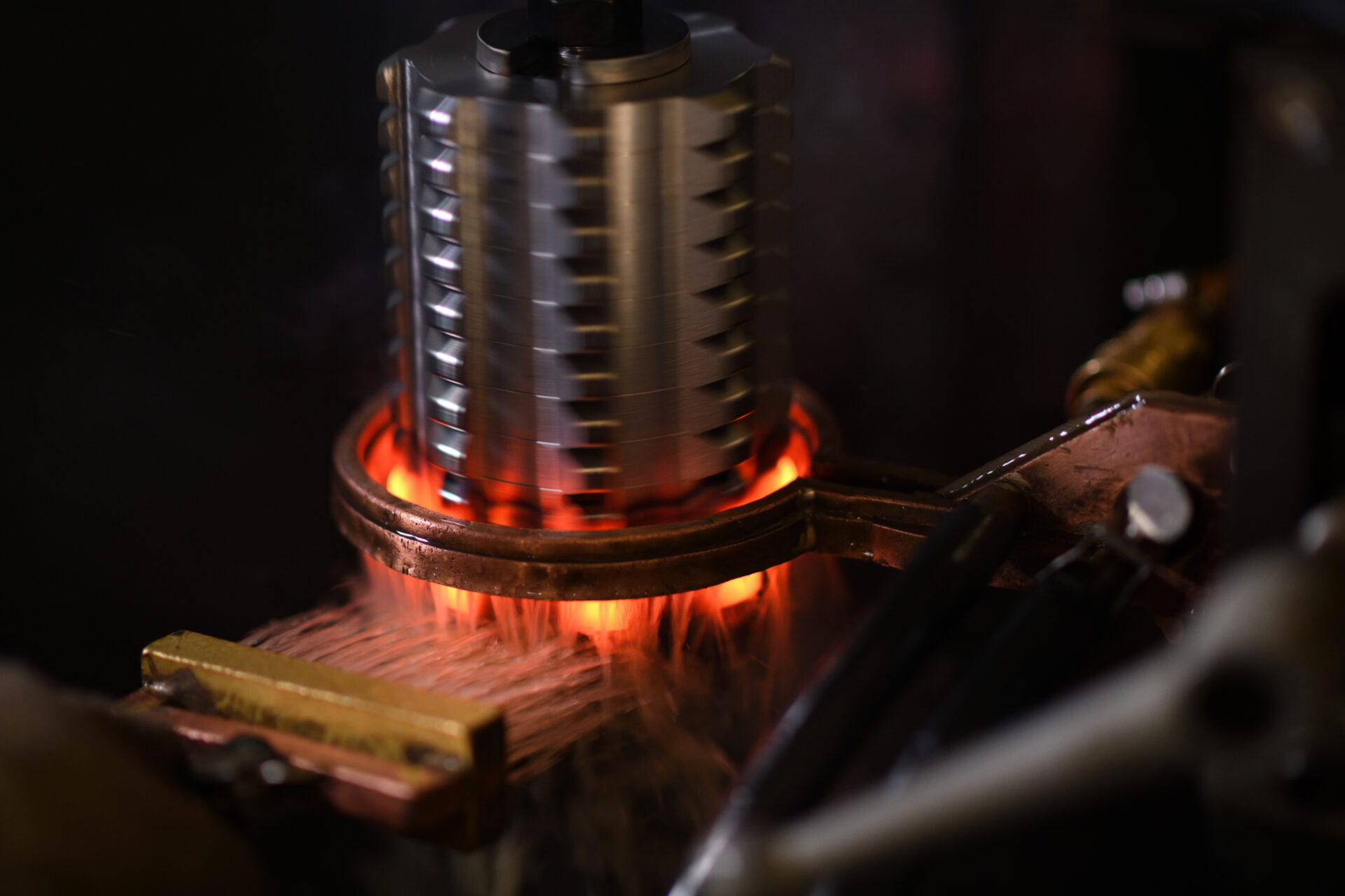 詳しくはこちら鋼の表面だけ電流を流し、噴水冷却します。鋼の表面が硬くなり、摩耗や疲労に対して強化されます。